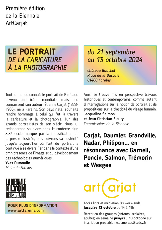 Tout le monde connaît le portrait de Rimbaud devenu une icône mondiale, mais peu connaissent son auteur : Etienne Carjat (1828-1906), né à Fareins dans notre beau Val de Saône1. Son pays natal souhaite rendre hommage à celui qui fut, à travers la caricature et la photographie, l’un des grands portraitistes de son siècle. Nous lui redonnerons sa place dans le contexte d’un XIXe siècle marqué par la massification de la presse illustrée, puis suivrons sa postérité jusqu’à aujourd’hui où l’art du portrait a continué à se diversifier dans le contexte d’une omniprésence de l’image et du développement des technologies numériques. Un premier événement sera organisé en 2024 à Fareins et dans le Val de Saône, inaugurant une série biennale de trois expositions et d’actions patrimoniales et culturelles dédiées à l’art du portrait, le portrait d’hier et le portrait contemporain d’aujourd’hui. Ce premier évènement privilégiera le portrait dessiné et caricaturé.